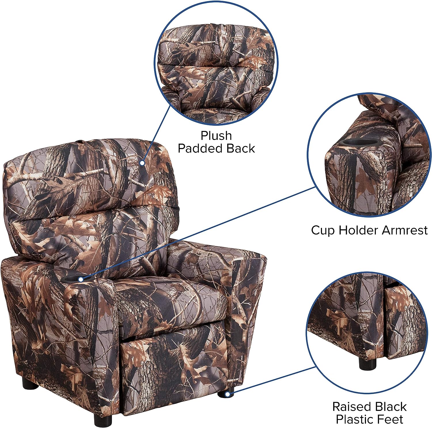 | Flash Furniture Chandler Contemporary Camouflaged Fabric Kids Recliner | 3+ years | Fabric | Cup holder armrest, fire retardant foam, solid hardwood frame construction, contemporary styling |